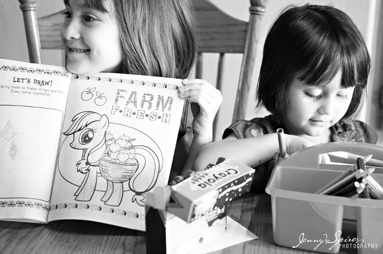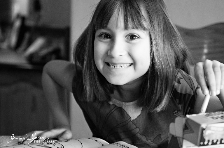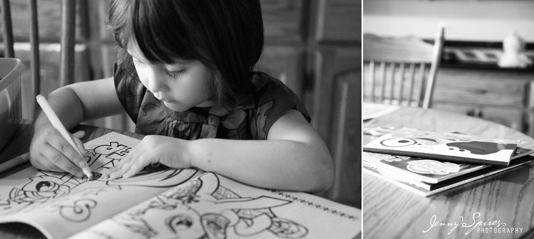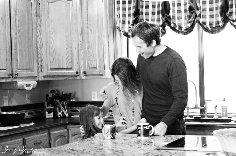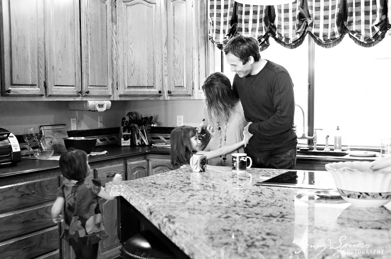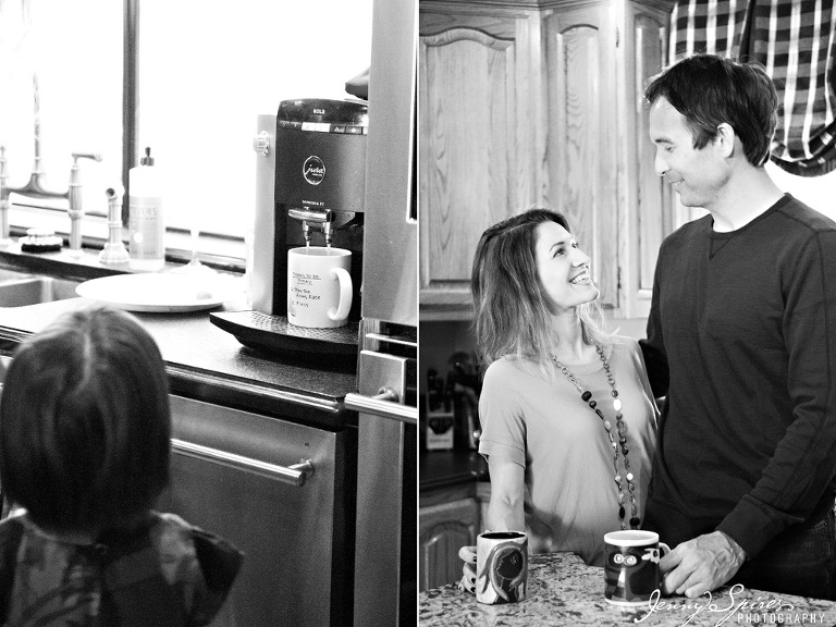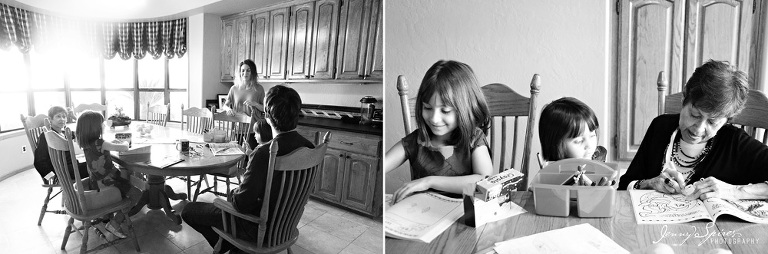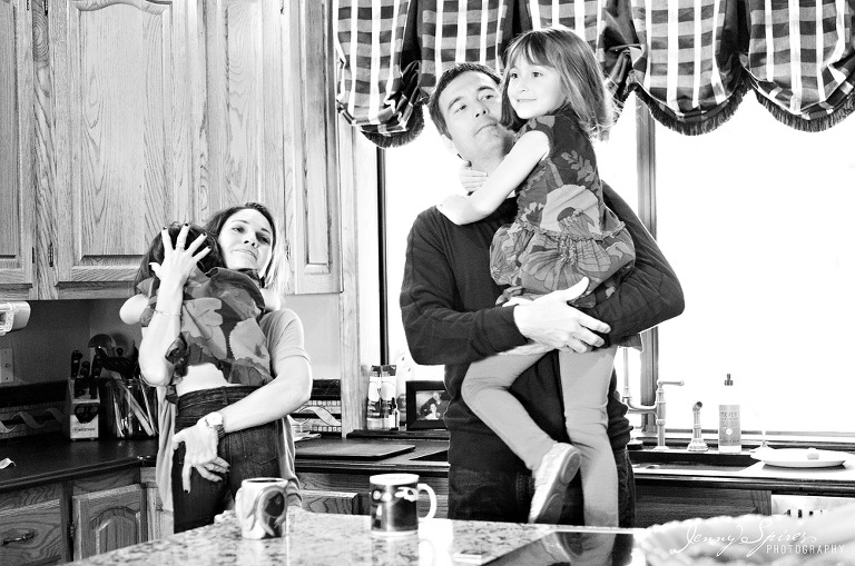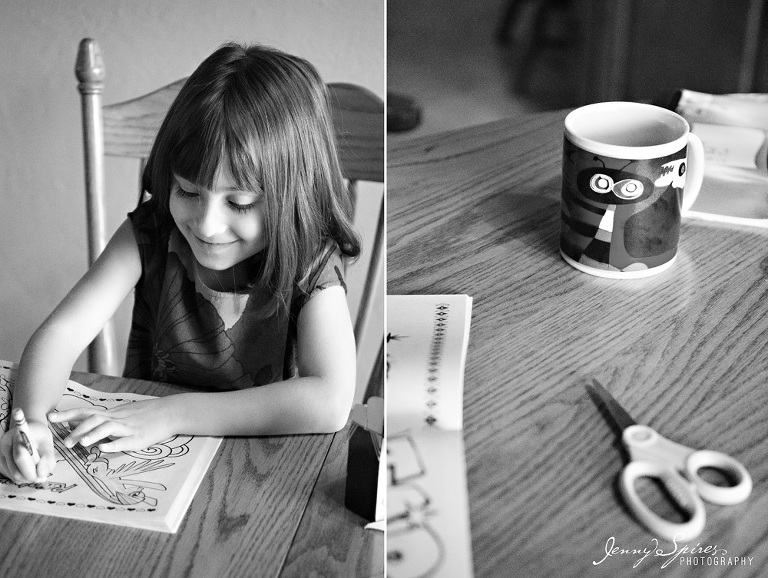 When I met Michelle and saw her house, I asked if we could take some time in our session before we “began” to capture some of their morning routine. She had already told me that she was drawn to my work because of the “in between” moments that are captured. She went on to tell me that she herself was an artist and that she wasn’t afraid to go the less traditional route for her photos. I knew her family would be great to play a bit. I went on to ask her what was typical for them to do in the morning and she quickly replied hanging out in their kitchen. It was the room that she fell in love with when they first bought the house and it became the space that they spent most of their time together. The girls quickly plopped down at the table to color as Mom and Dad drank their morning coffee. Michelle’s mother was even there to join in.