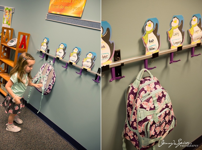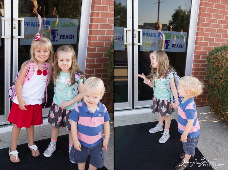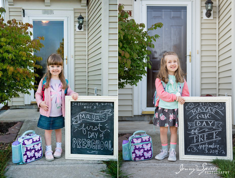 Love this one. And I’m not sure why I switched the order from the other comparison photo. Left is last year and right is this year. I feel like she’s changed SO much in just a year. She had the obvious physical differences like growing out her bangs and being a couple inches taller. And I didn’t realize how similar her little outfit was to last years with her skirt and a layered sweater (this years’ was off before we even made it in to school as it got hot today!). Maya did have her own outfit ideas that she had to have this year like the striped socks and jewelry. Pretty cute.